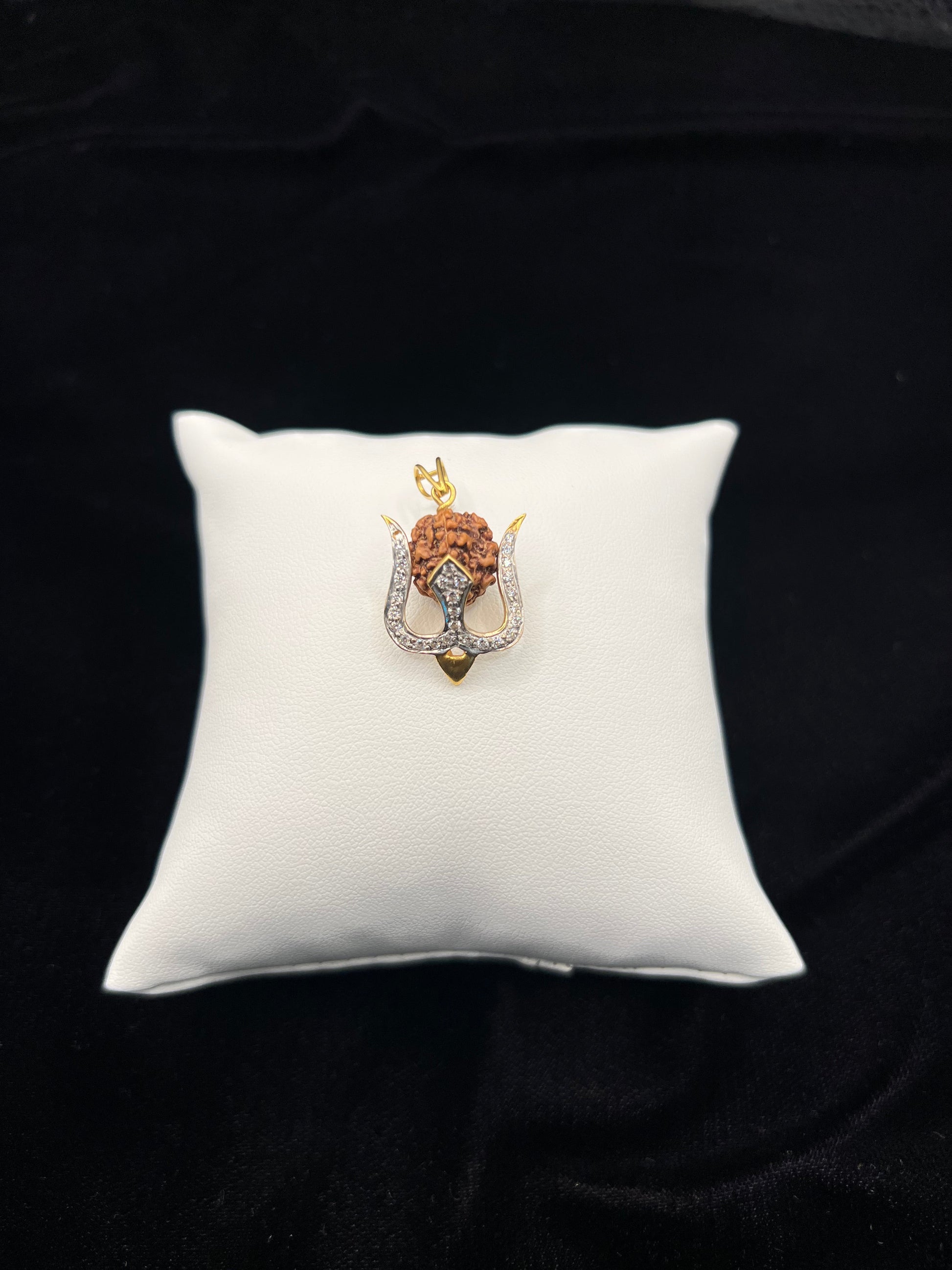 Please Submit the form below to inquire about pricing, availability, special requests and general inquiries22KT gold Trishul Rudraksha pendant accented with sparkling stones. A divine and powerful design symbolizing strength, protection, and spiritual energy.