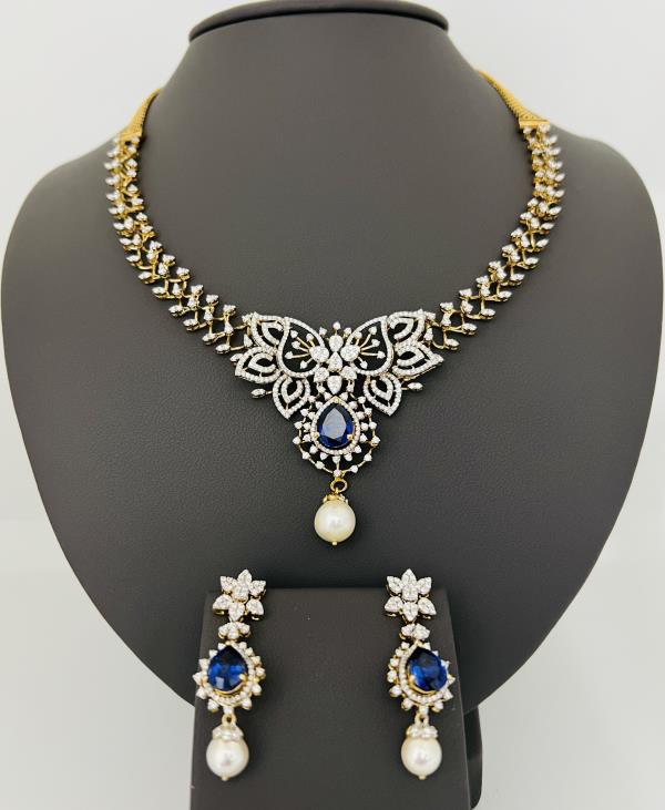 Please Submit the form below to inquire about pricing, availability, special requests and general inquiriesElegant 18KT gold diamond necklace set adorned with deep blue sapphires and lustrous pearls. The butterfly-inspired centerpiece adds a graceful touch, making it ideal for weddings, parties, and special celebrations.